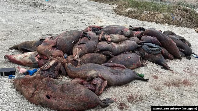Xəzər dənizi sahilində ölü suiti cəsədləri.