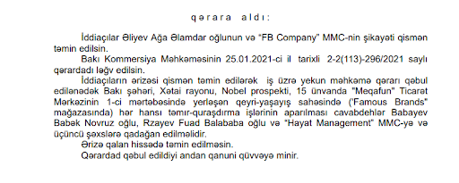 – Məsələ ondadır ki, Bakı Apellyasiya Məhkəməsi 2021-ci ilin martında ticarət mərkəzinin səhmdarlarına yekun qərar qəbul olunana qədər “Famous Brands” mağazasının ərazisində hər hansı təmir işlərinin aparılmasını qadağan edib, – Qəribov hekayəsinə davam edir. – Cəmiyyətdəki mövqeyindən asılı olmayaraq məhkəmənin hökmü hamı üçün məcburidir. Bu, birbaşa vəzifəsi məhkəmə hökmlərinin icrasını təmin etmək olan probasiya xidməti üçün ikiqat məcburidir.