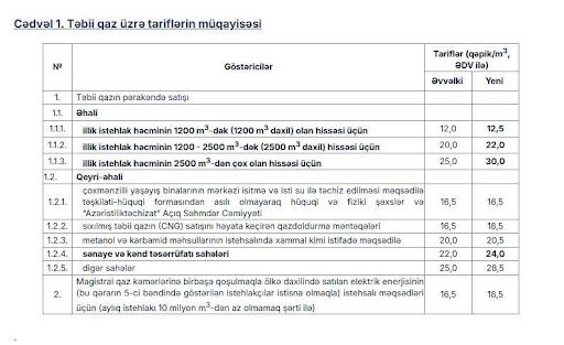 1200 kub metr olan hissə üçün 1 kub metr təbii qazın tarifi 0,5 qəpik (yarım qəpik, 4,2%) artırılaraq 12 qəpikdən 12,5 qəpik həddində;