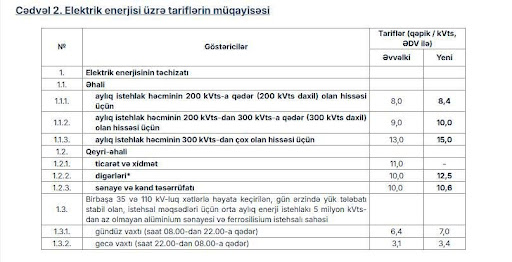 200 kVts olan hissə üçün 1 kilovatt saat elektrik enerjisinin tarifi 0,4 qəpik (5%) artırılaraq 8 qəpikdən 8,4 qəpiyə;
