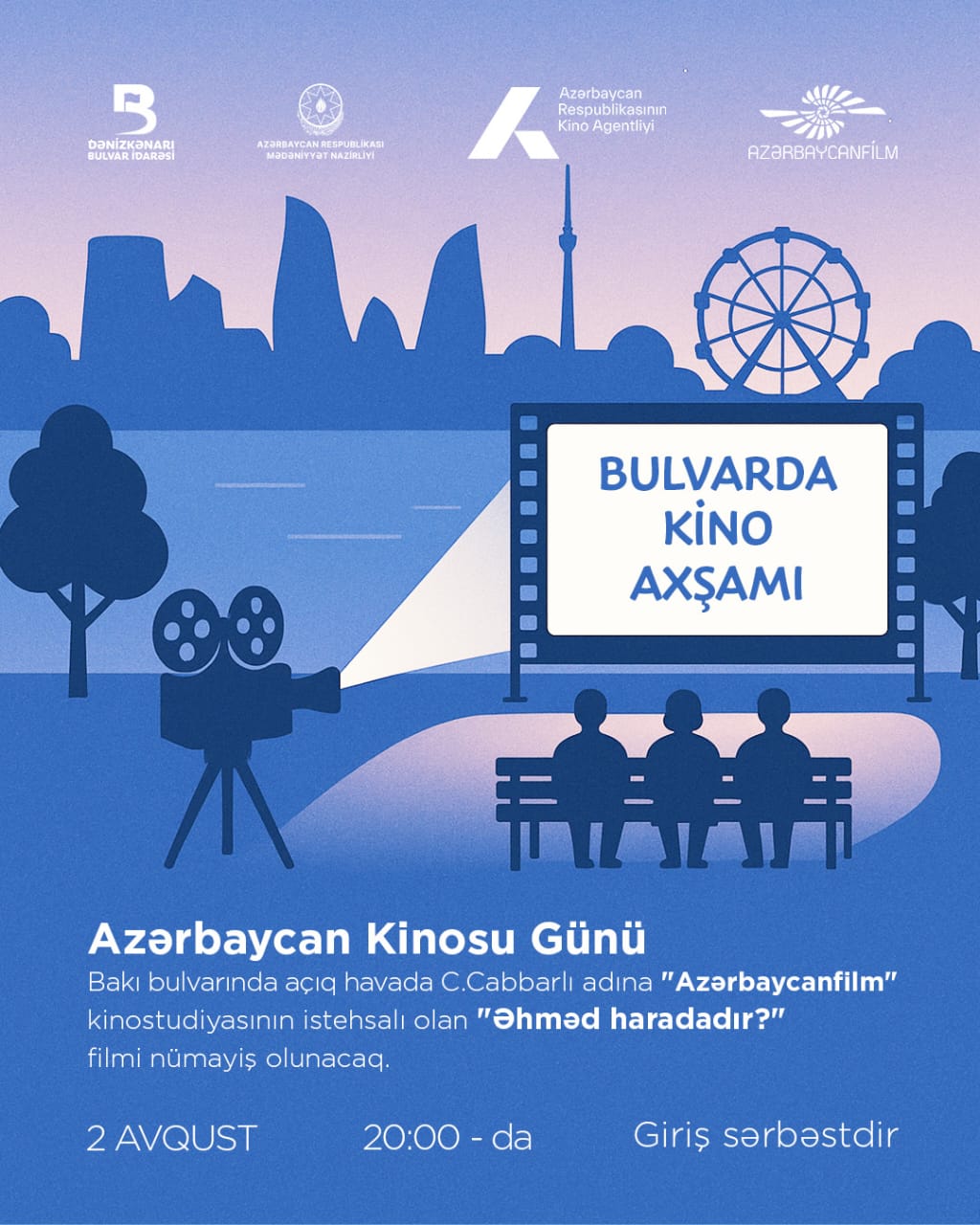 2 avqust – Azərbaycan Kinosu Günü münasibətilə Dənizkənarı Bulvar İdarəsi və Cəfər Cabbarlı adına “Azərbaycanfilm” kinostudiyasının birgə təşkilatçılığı, Mədəniyyət Nazirliyi və Azərbaycan Respublikasının Kino Agentliyinin dəstəyi ilə açıq havada “Əhməd haradadır?” filminin nümayişi keçiriləcək.