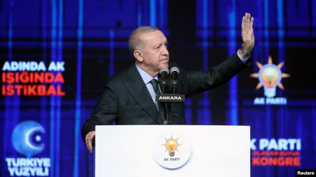 Türkiyə prezidenti Ərdoğan Ankarada hakim AKP-nin Böyük Qurultayında tərəfdarlarını salamlayır.